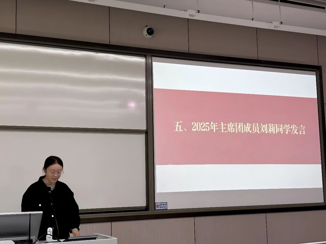 新一届研究生会主席团成员刘莉同学对上一届研会的工作成果表示感谢。她提出新一届研会将从三个方面开展工作:一是做“学术的同行者”,持续举办学术沙龙活动;二是做“实践的搭桥人”,开展政企参访与课题合作;三是做“生活的暖心人”,优化研途互助计划。她表示主席团将秉持服务同学的初心,带领研会成为一个有温度、有深度、有力量的集体。